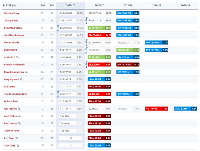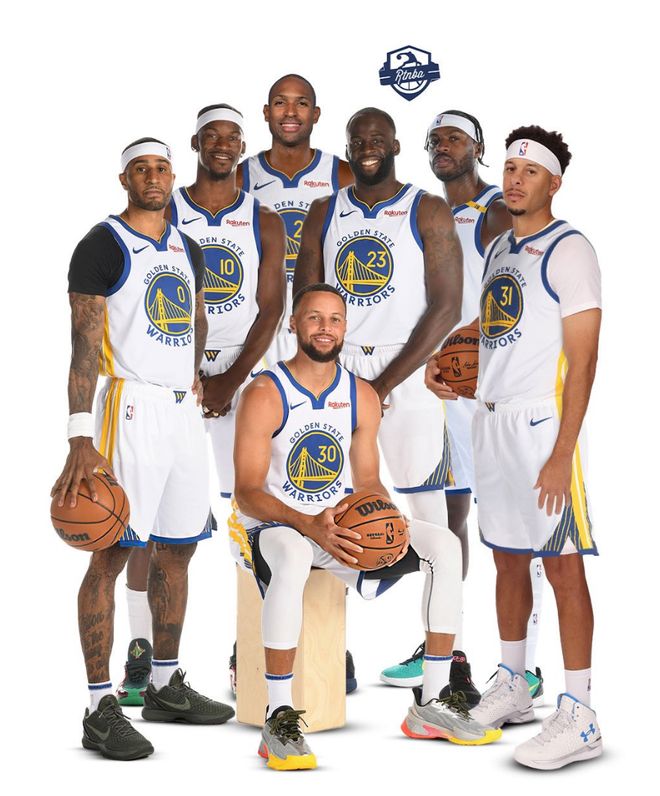 库里、巴特勒、追梦、库明加、穆迪、希尔德、波杰姆斯基、桑托斯、戴维斯、波斯特、霍福德、佩顿、梅尔顿、理查德、赛思;罗维、图希、斯潘塞(三个双向)
