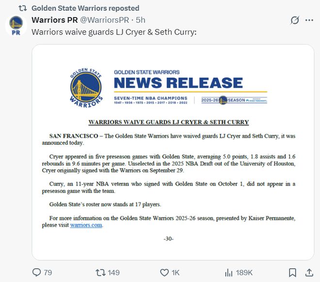 北京时间10月19日,勇士队官方宣布裁掉了LJ-克莱尔、塞思-库里,此举是让勇士队的阵容回归14+3,因为LJ-克莱尔与塞思-库里都是训练营合同。