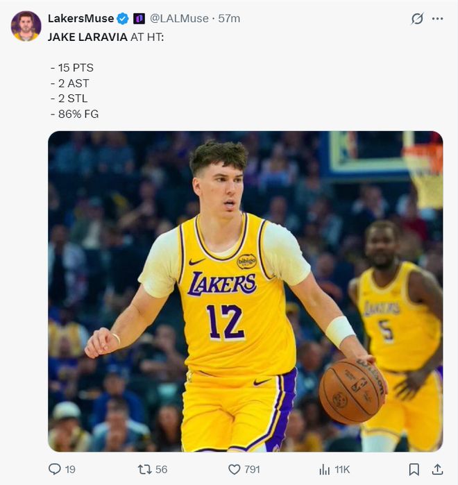 这场比赛是湖人背靠背的第一场,今夜打了热火,明晚又要打开拓者,所以雷迪克扩大了轮换布朗尼得到了一些时间,不过还是一套主力9人轮换而已,替补席上拿600万的拉拉维亚就是尖刀,在东契奇、里夫斯手感都不佳的情况下他成为第三巨头,首节2中2+三分1中1拿到6分1抢断。
